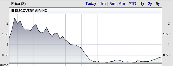 But sometimes being good is not good enough. Despite Taylor's extensive background in aviation and finance and his ties to Canada's north, Discovery Air has had a very rough flight. Check out the attached graph charting the history of its rapidly descending stock price.